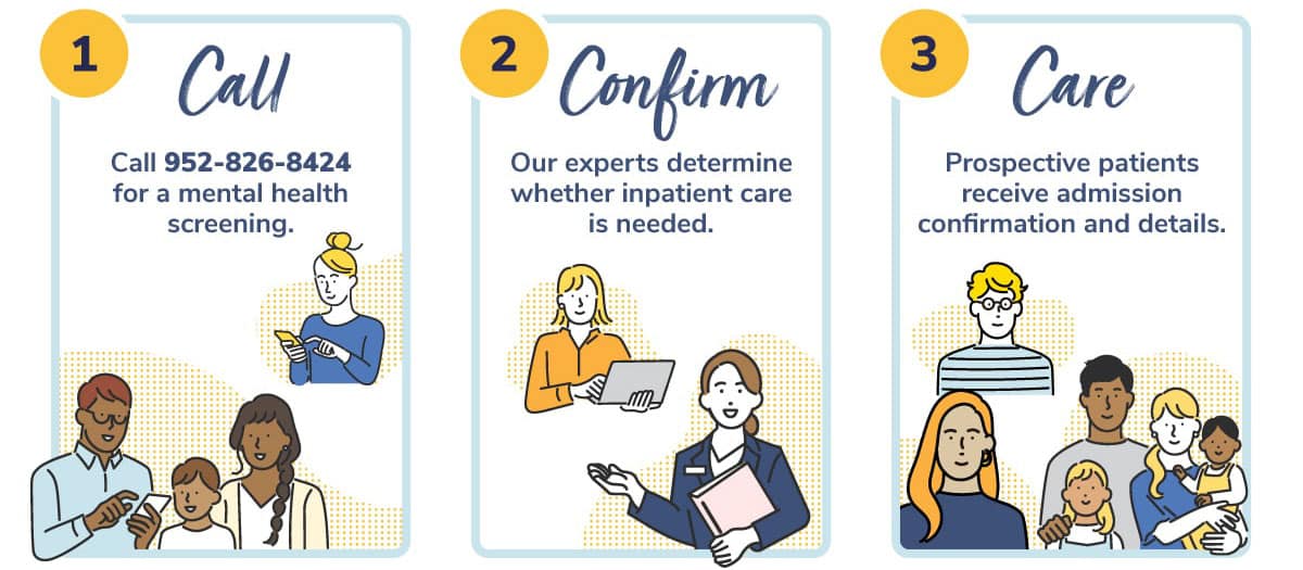 We understand how difficult it can be when you or a loved one is experiencing emergency mental health symptoms. Through our Family First admissions process, you don’t have to wait hours in the ER waiting room—instead, parents and patients over 18 can call our team at 952-826-8424 to start immediate treatment at our hospital for anyone 35 and younger.