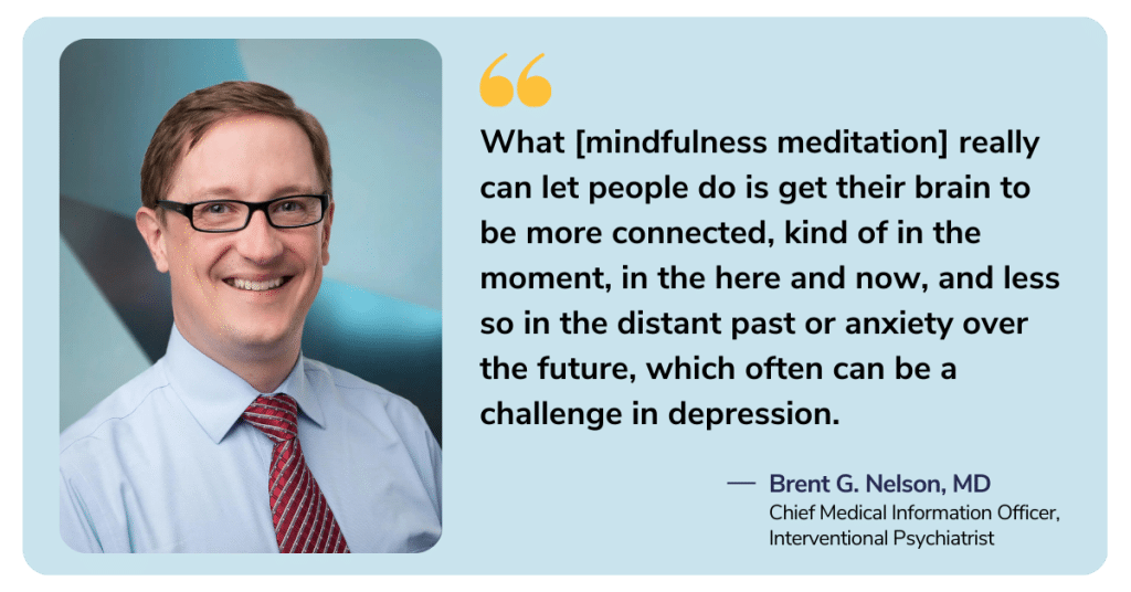 “A lot of times we will start with mindfulness meditation because what it really can let people do is get their brain to be more connected, kind of in the moment, in the here and now, and less so in the distant past or anxiety over the future, which often can be a challenge in depression,” he adds.