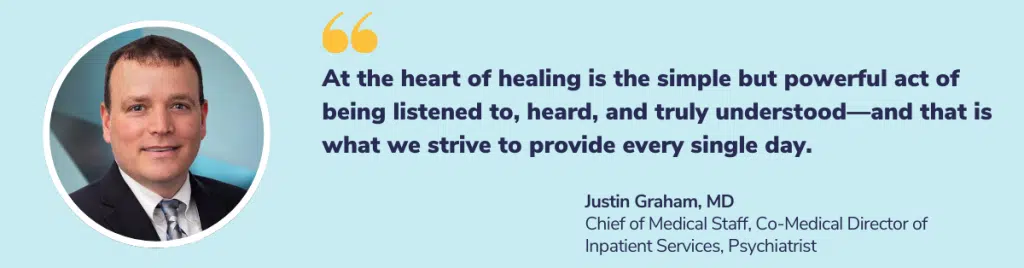 This leadership is focused on creating long-term healing, beyond addressing the symptoms a patient is experiencing during their initial intake. Chief Medical Officer Christopher Wall, MD, explains: “Our ‘treatment to remission’ philosophy means we’re aiming for complete healing, not just stabilizing crises. While we can’t ‘cure’ all mental illnesses, we can help reduce symptoms to a minimum so that people can live normally again. That’s the goal—to move beyond survival into recovery.”