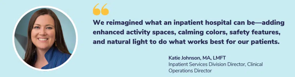 This same sentiment extends to our highest level of care—our inpatient hospital. Katie Johnson, MA, LMFT, who started with PrairieCare as an inpatient therapist nearly a decade ago, and is now the Inpatient Services Division Director and Clinical Operations Director, explains: “For patients struggling with significant concerns, receiving care within a system that can provide both outpatient and inpatient care is invaluable. When PrairieCare doesn’t offer a specific service, we connect families to resources outside our system. When people place their trust in us, we do everything we can to find them the support they need.”